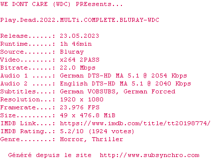 Voir le nfo de la release Play.Dead.2022.MULTi.COMPLETE.BLURAY-WDC