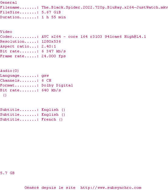 | JustWatch | The.Black.Spider.2022.1080p.BluRay.x264-JustWatch OpenSubtitles | 0 fichier | |||