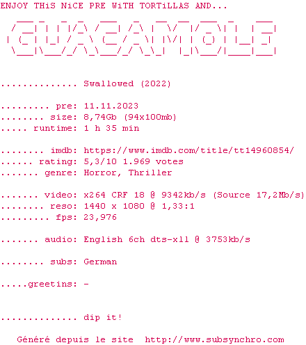 Voir le nfo de la release Swallowed.2022.BDRiP.x264-GUACAMOLE