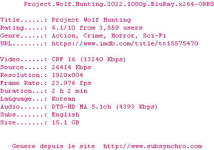 Voir le nfo de la release Project.Wolf.Hunting.2022.1080p.BluRay.x264-ORBS