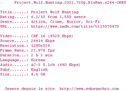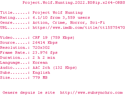 Voir le nfo de la release Project.Wolf.Hunting.2022.720p.BluRay.x264-ORBS