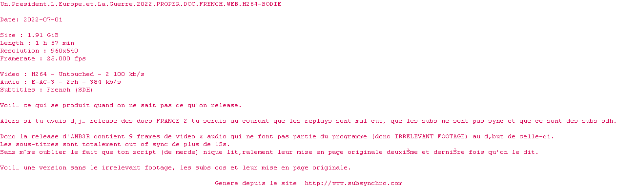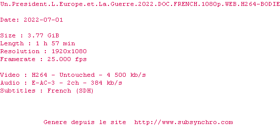 Voir le nfo de la release Un.President.L.Europe.Et.La.Guerre.2022.PROPER.DOC.FRENCH.WEB.H264-BODIE