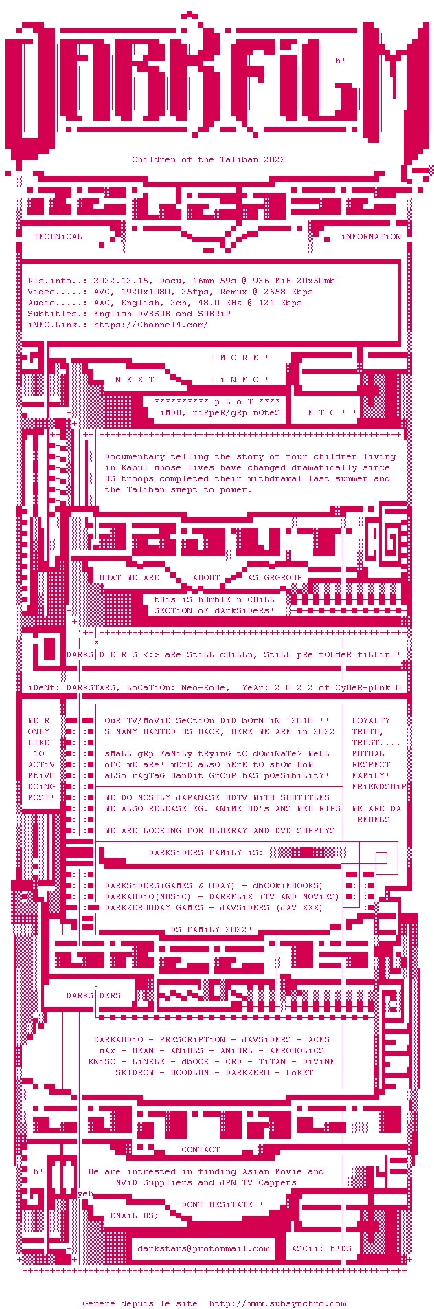 Voir le nfo de la release Children.Of.The.Taliban.2022.1080p.HDTV.H264-DARKFLiX