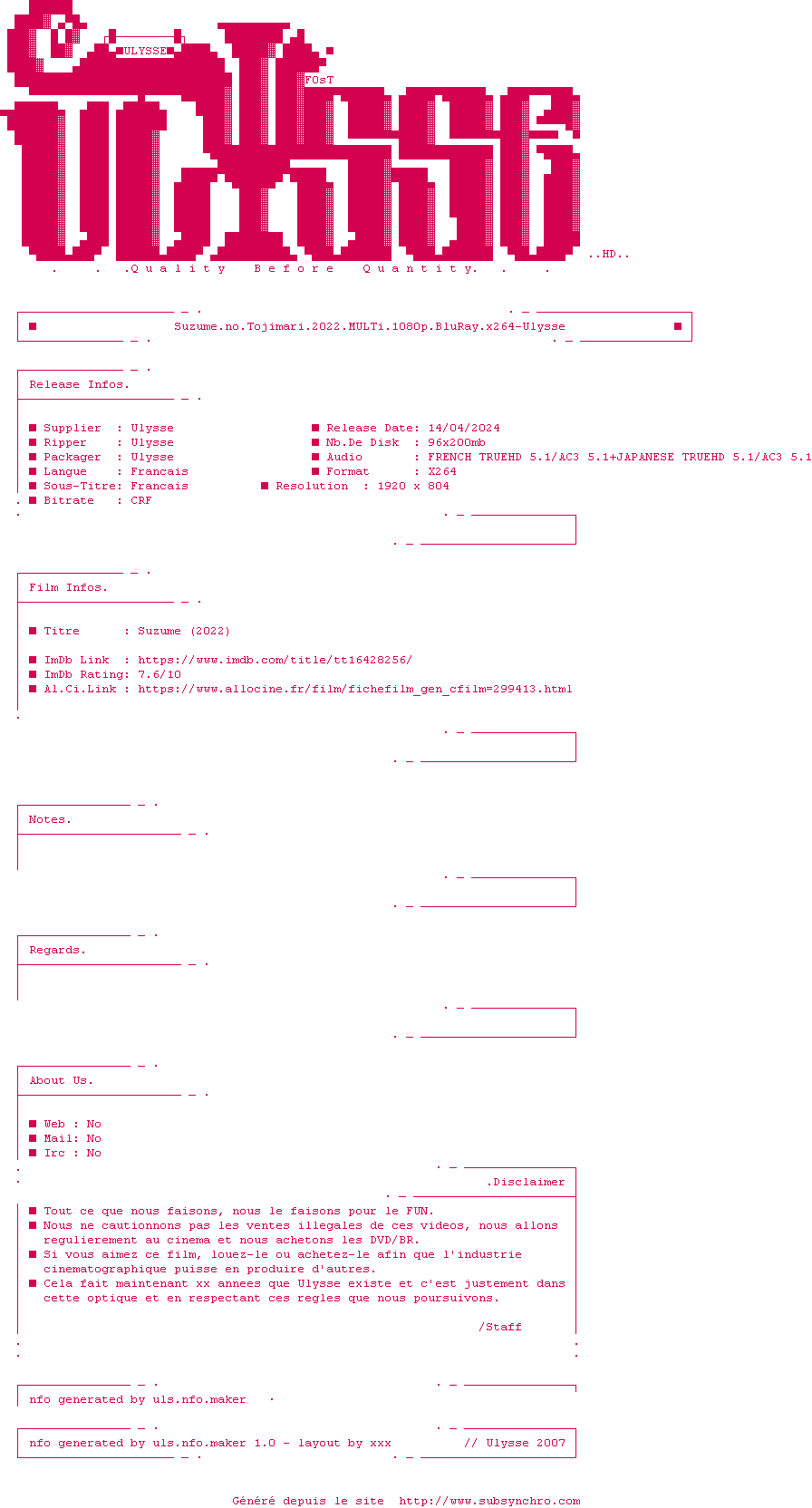 Voir le nfo de la release Suzume.No.Tojimari.2022.MULTi.1080p.BluRay.x264-Ulysse
