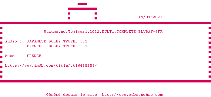 Voir le nfo de la release Suzume.No.Tojimari.2022.MULTi.COMPLETE.BLURAY-4FR