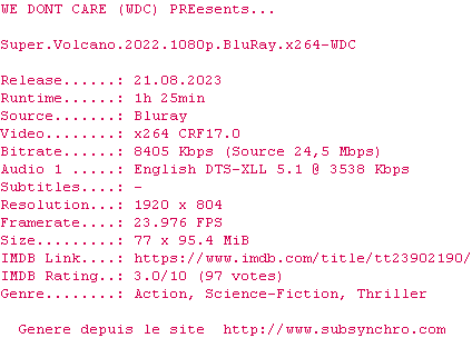 Voir le nfo de la release Super.Volcano.2022.1080p.BluRay.x264-WDC