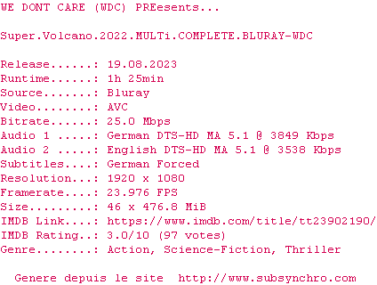 Voir le nfo de la release Super.Volcano.2022.MULTi.COMPLETE.BLURAY-WDC