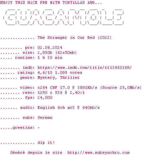 Voir le nfo de la release The.Stranger.In.Our.Bed.2022.BDRiP.x264-GUACAMOLE