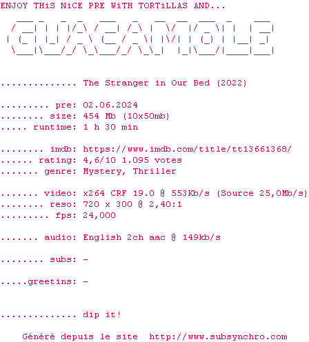Voir le nfo de la release The.Stranger.In.Our.Bed.2022.720p.BluRay.x264-GUACAMOLE