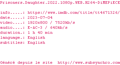 | GalaxyRG | Prisoners.Daughter.2023.720p.WEBRip.800MB.x264-GalaxyRG OpenSubtitles | 0 fichier |