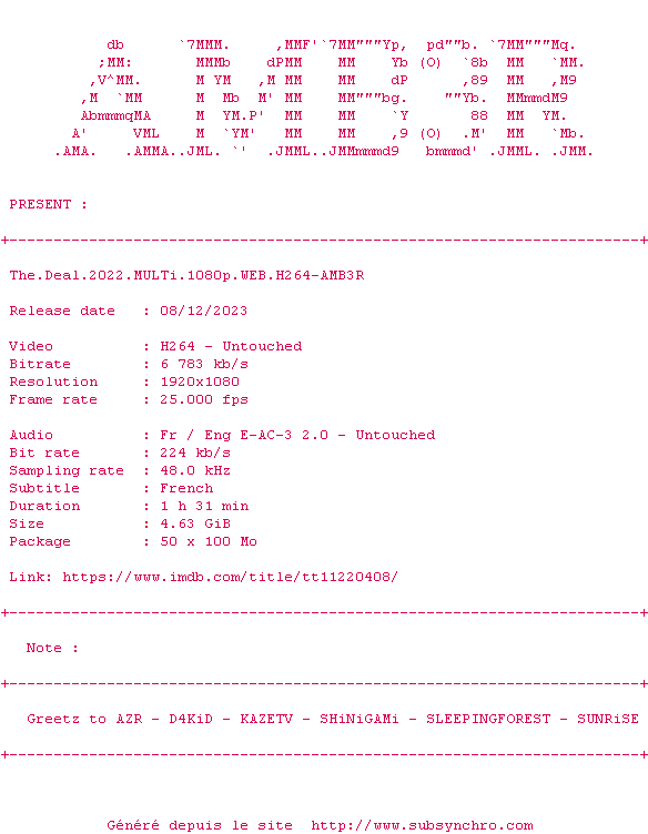 | Voir le nfo de la release The.Deal.2022.MULTi.1080p.WEB.H264-AMB3R | AMB3R | The.Deal.2022.MULTi.1080p.WEB.H264-AMB3R OpenSubtitles | 0 fichier | ||