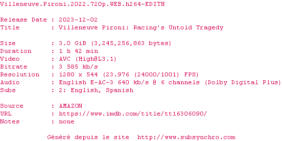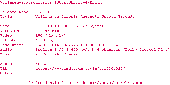 Voir le nfo de la release Villeneuve.Pironi.2022.2160p.WEB.H265-BAWD