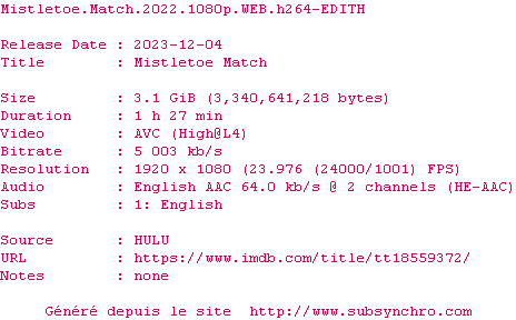| Voir le nfo de la release Mistletoe.Match.2022.1080p.WEB.H264-EDITH | EDITH | Mistletoe.Match.2022.1080p.WEB.H264-EDITH OpenSubtitles | 0 fichier | ||