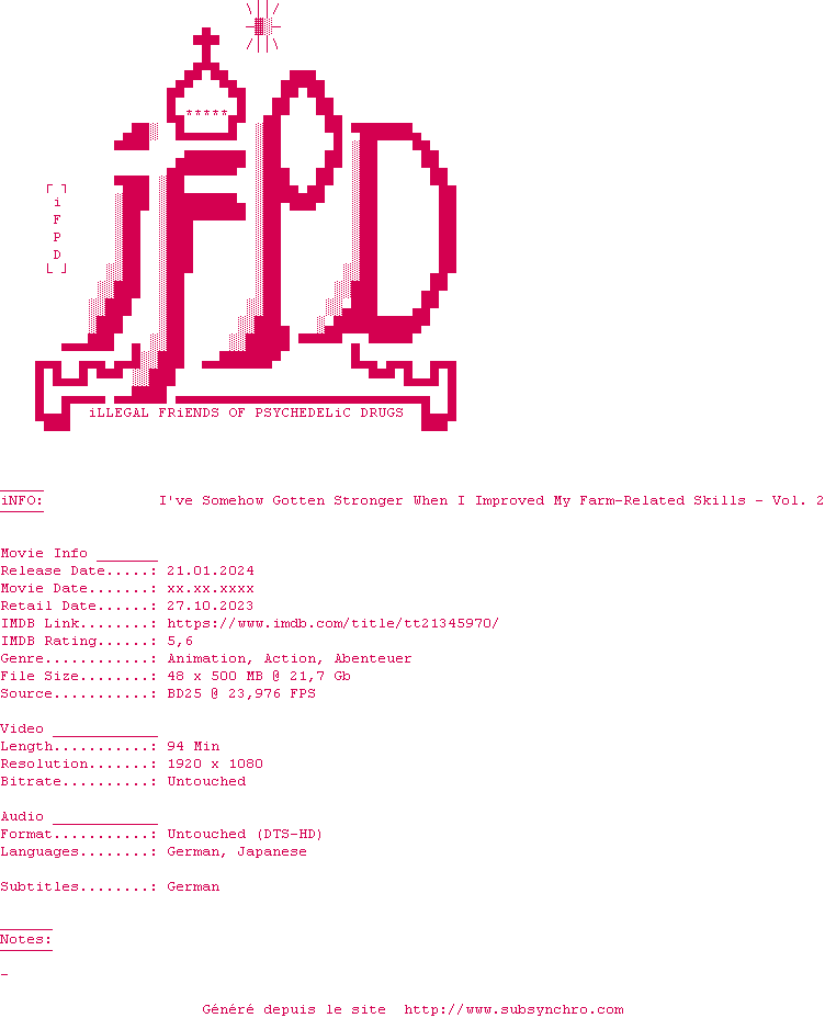 Voir le nfo de la release Ive.Somehow.Gotten.Stronger.When.I.Improved.My.Farm.Related.Skills.Vol.2.2022.ANiME.DUAL.COMPLETE.BLURAY-iFPD