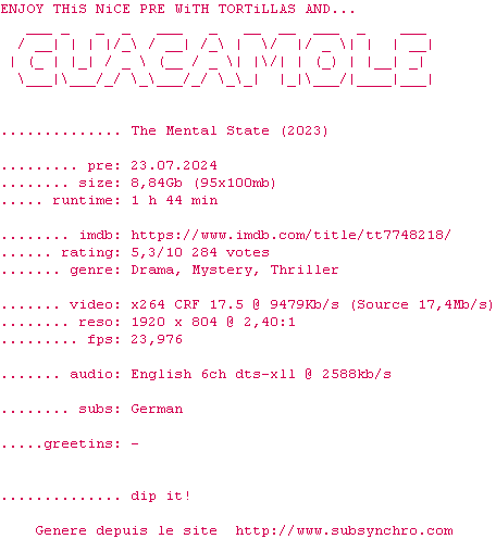 Voir le nfo de la release The.Mental.State.2023.MULTi.COMPLETE.BLURAY-SharpHD