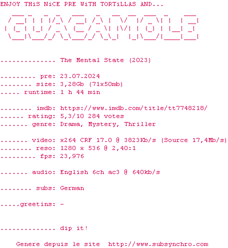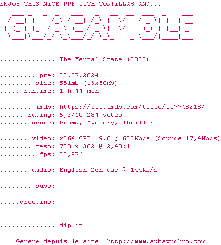 Voir le nfo de la release The.Mental.State.2023.720p.BluRay.x264-GUACAMOLE