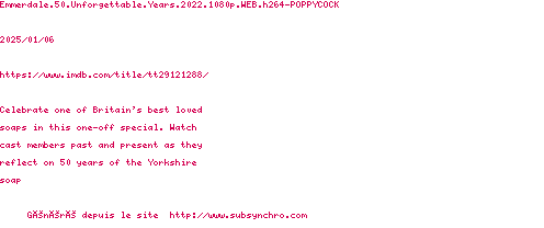 | Voir le nfo de la release Emmerdale.50.Unforgettable.Years.2022.1080p.WEB.H264-POPPYCOCK | POPPYCOCK | Emmerdale.50.Unforgettable.Years.2022.1080p.WEB.H264-POPPYCOCK OpenSubtitles | 0 fichier |