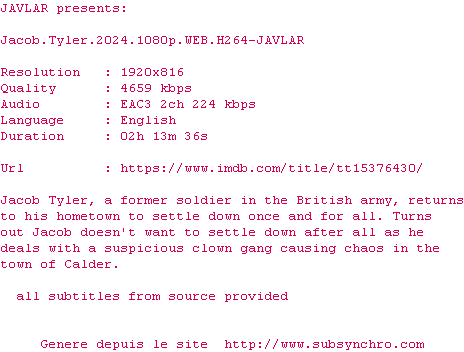 | AOS | Jacob.Tyler.2024.1080p.WEB-DL.EAC3.DDP5.1.H264-AOS OpenSubtitles | 0 fichier | |||