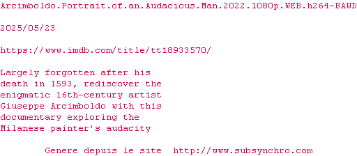 | Voir le nfo de la release Arcimboldo.Portrait.Of.An.Audacious.Man.2022.1080p.WEB.H264-BAWD | BAWD | Arcimboldo.Portrait.Of.An.Audacious.Man.2022.1080p.WEB.H264-BAWD OpenSubtitles | 0 fichier |