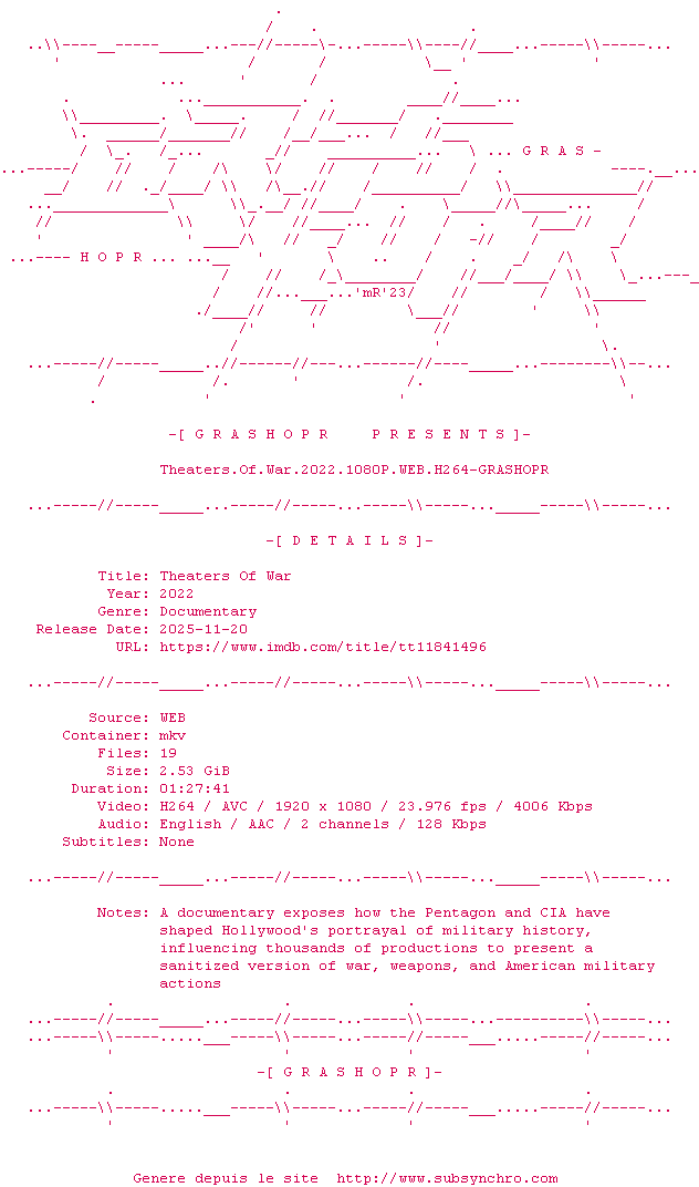 | Voir le nfo de la release Theaters.Of.War.2022.1080P.WEB.H264-GRASHOPR | GRASHOPR | Theaters.Of.War.2022.1080P.WEB.H264-GRASHOPR OpenSubtitles | 0 fichier | ||