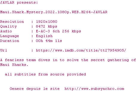 | Voir le nfo de la release Maui.Shark.Mystery.2022.1080p.WEB.H264-JAVLAR | JAVLAR | Maui.Shark.Mystery.2022.1080p.WEB.H264-JAVLAR OpenSubtitles | 0 fichier |
