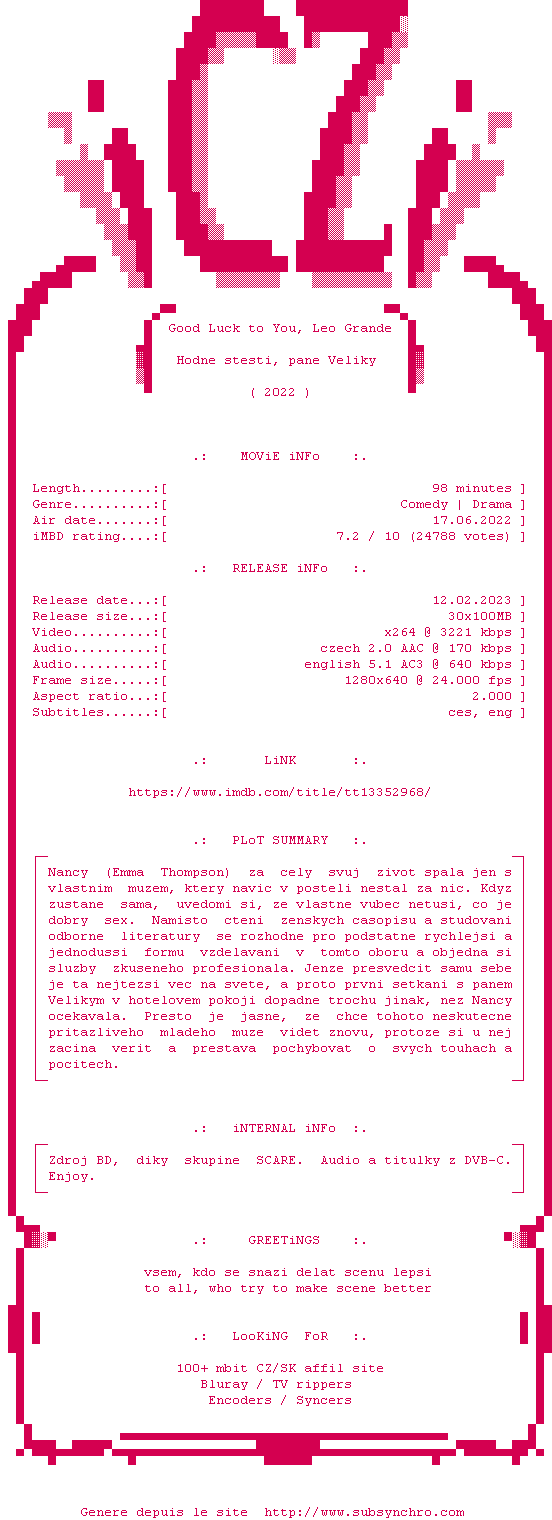 Y avez-vous pense ? Nous proposons déjà 11 sous-titres pour le film Mes rendez-vous avec Leo. Avez-vous essaye de voir si ces sous-titres etaient compatibles avec cette release ? On vous laisse le soin de tester cela pour nous et de contribuer au site en postant le sous-titre en cas de compatiblite constatee !