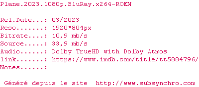 Voir le nfo de la release Plane.2023.1080p.BluRay.x264-ROEN