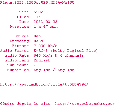 Voir le nfo de la release Plane.2023.1080p.WEB.H264-NAISU