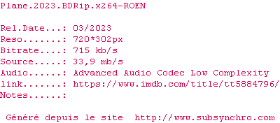 Voir le nfo de la release Plane.2023.720p.BluRay.x264-ROEN