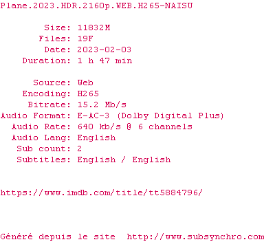 Voir le nfo de la release Plane.2023.HDR.2160p.WEB.H265-NAISU