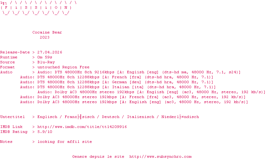 Y avez-vous pense ? Nous proposons déjà 2140 sous-titres pour le film Crazy Bear. Avez-vous essaye de voir si ces sous-titres etaient compatibles avec cette release ? On vous laisse le soin de tester cela pour nous et de contribuer au site en postant le sous-titre en cas de compatiblite constatee !