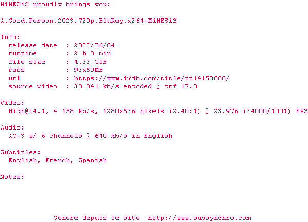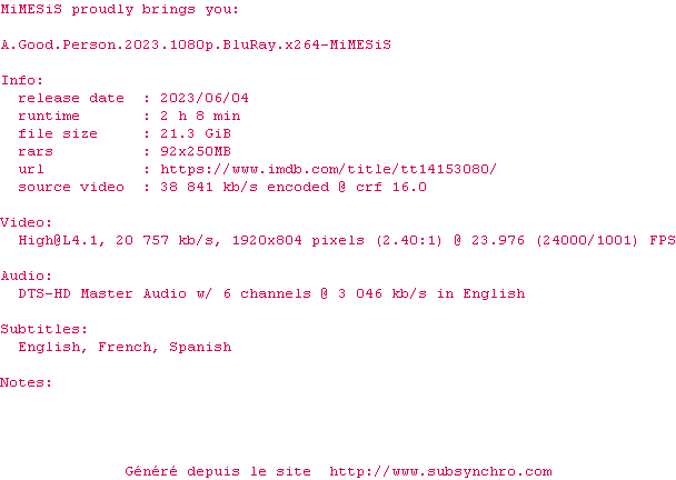 Voir le nfo de la release A.Good.Person.2023.1080p.BluRay.x264-MiMESiS