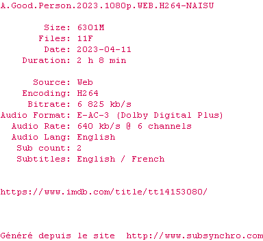Voir le nfo de la release A.Good.Person.2023.1080p.WEB.H264-NAISU