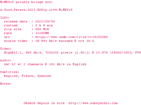 Voir le nfo de la release A.Good.Person.2023.BDRip.x264-MiMESiS