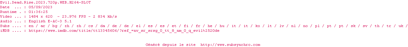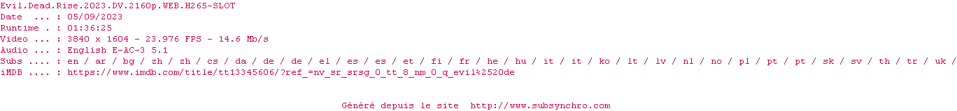 Le commentaire de SubSynchro Commente par SubSynchro (502), Le Samedi 29 Avril 2023 à 21h49 D’habitude quand je vais au cinéma, je ne vais voir que des comédies mais là , j’avais vu tout ce qui était comique dans le cinéma où j'étais donc j’ai voulu aller voir un film un peu tendance et j’ai été voir le dernier volet de la série de Evil Dead… En général, je note le film 10/10 quand la comédie m’a fait rire et que le film m’a détendu et amusé mais là j’ai été voir un film d’horreur et je le note également 10/10 car j’ai eu peur et le film m’a traumatisé ! Comme je suis devenu très altruiste depuis mon accident je ne pourrai conseillé à personne d’aller voir ce film d’horreur effrayant et cela même à mon pire ennemi...Bon après si la personne veut aller voir un film la chahutant je ne peux que l’encourager à y aller effectivement car moi je ressors terrorisé de ma séance de cinéma ! On dit que gérer le COViD est compliqué mais s'il nous arrivait la même chose bah ça serait bien pire ! Le voir sur grand écran dans une salle de cinéma bien sombre a rendu le film encore plus prenant ! En attendant regardez la bande-annonce après avoir lu mon avis:D 10 / 10 0 0