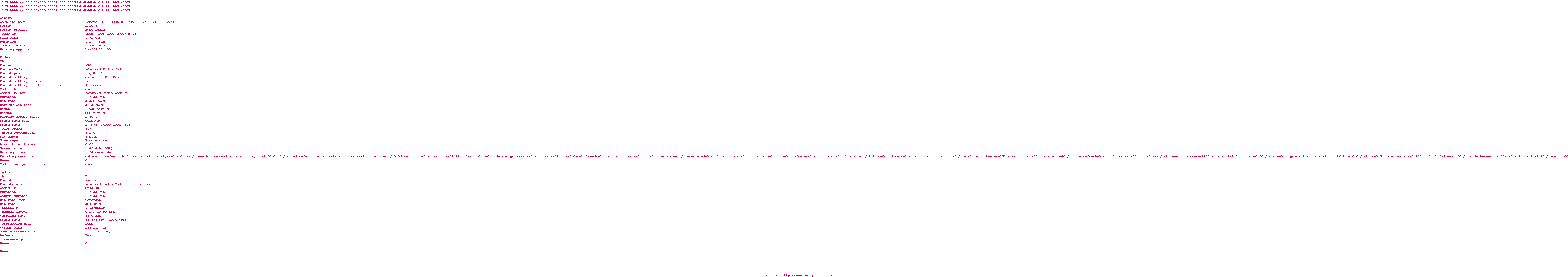 | Voir le nfo de la release Robots.2023.1080p.BluRay.x264.AAC5.1-LAMA | LAMA | Robots.2023.1080p.BluRay.x264.AAC5.1-LAMA OpenSubtitles | 0 fichier | ||