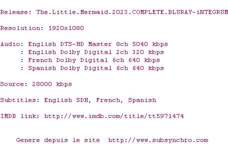 Le commentaire de SubSynchro Commente par SubSynchro (507), Le Lundi 29 Mai 2023 à 00h03 J'ai vu ce film avec une demoiselle qui n'avait pas vu le dessin animé original de 1989 et elle a cependant trouvé cette version très agréable.... C'était pourtant très sympathique de voir ce film quand on a déjà vu le dessin animé d’origine car nous revivons les mêmes émotions d’humour, d’amour et de voyage... Sauf que en plus ce n’est plus juste un dessin animé car tous les décors sont bien réels et nous visitons ce vrai cet univers aquatique. Je me suis senti jeune de revoir ces références d'il y a 30 ans et je le suis pourtant senti faible en sentant les larmes monter en réentendant les versions modernes de « Sous L'océan » et « Partir là -bas » Bref, on a beau être devenu de snobs adultes, nous avons quand même passé un formidable voyage ! 10 / 10 0 0