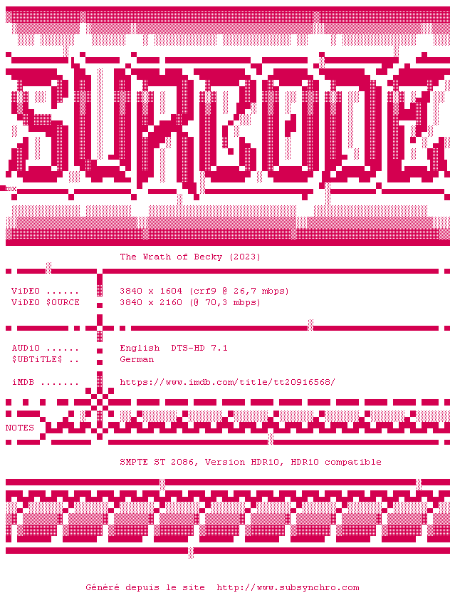 Voir le nfo de la release The.Wrath.Of.Becky.2023.2160p.UHD.BluRay.x265-SURCODE