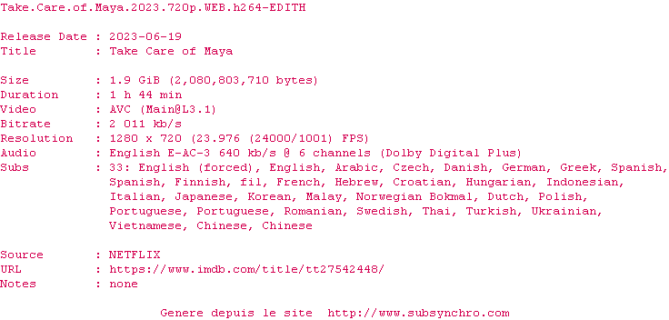 Voir le nfo de la release Take.Care.Of.Maya.2023.720p.WEB.H264-EDITH