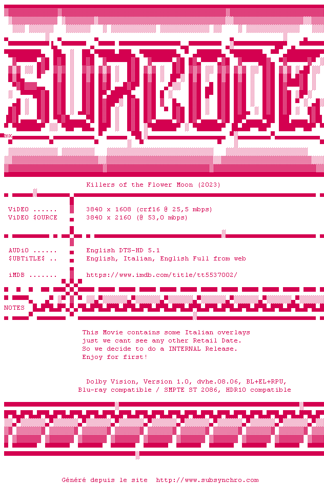 Voir le nfo de la release Illers.Of.The.Flower.Moon.2023.iNTERNAL.2160p.UHD.BluRay.x265-SURCODE