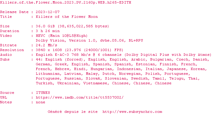 Voir le nfo de la release Killers.Of.The.Flower.Moon.2023.DV.2160p.WEB.H265-EDITH
