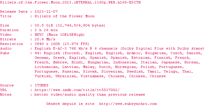 Voir le nfo de la release Killers.Of.The.Flower.Moon.2023.iNTERNAL.2160p.WEB.H265-EDITH