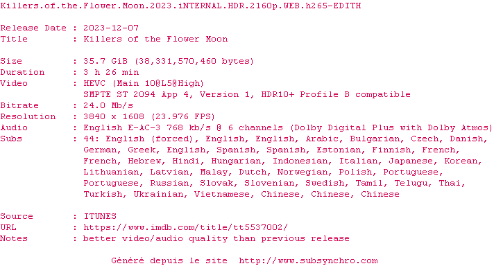 Voir le nfo de la release Killers.Of.The.Flower.Moon.2023.iNTERNAL.HDR.2160p.WEB.H265-EDITH