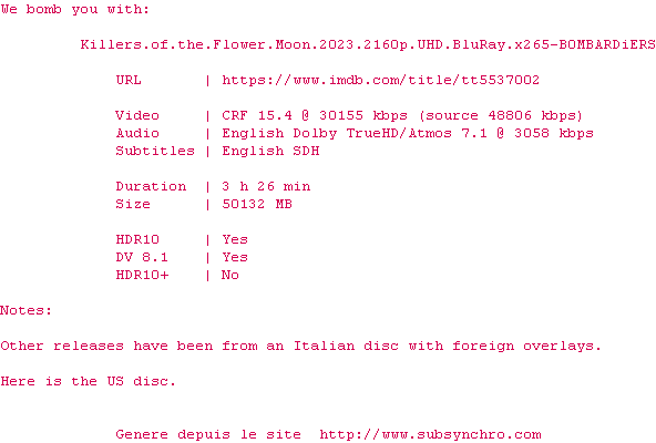 Y avez-vous pense ? Nous proposons déjà 1289 sous-titres pour le film Killers of the Flower Moon. Avez-vous essaye de voir si ces sous-titres etaient compatibles avec cette release ? On vous laisse le soin de tester cela pour nous et de contribuer au site en postant le sous-titre en cas de compatiblite constatee !