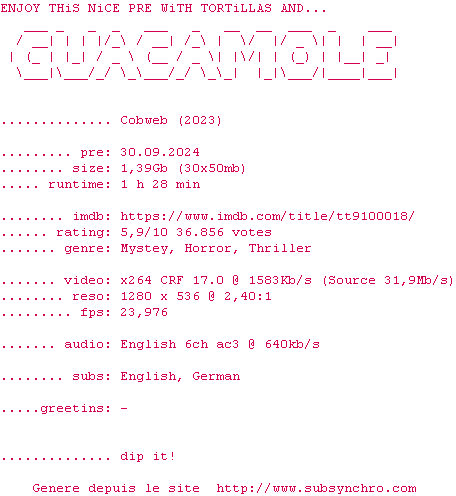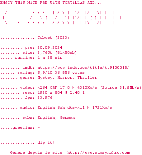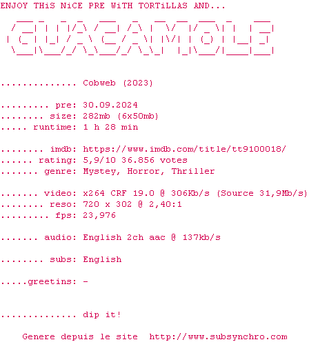 Voir le nfo de la release Cobweb.2023.BDRiP.x264-GUACAMOLE