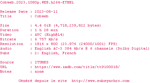 Voir le nfo de la release Cobweb.2023.HDR.2160p.WEB.H265-ETHEL