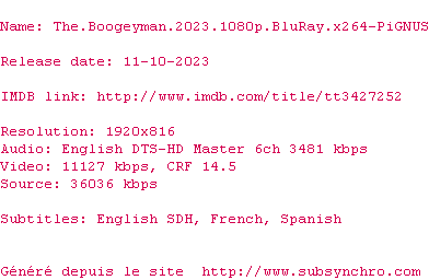 Voir le nfo de la release The.Boogeyman.2023.BDRip.x264-PiGNUS