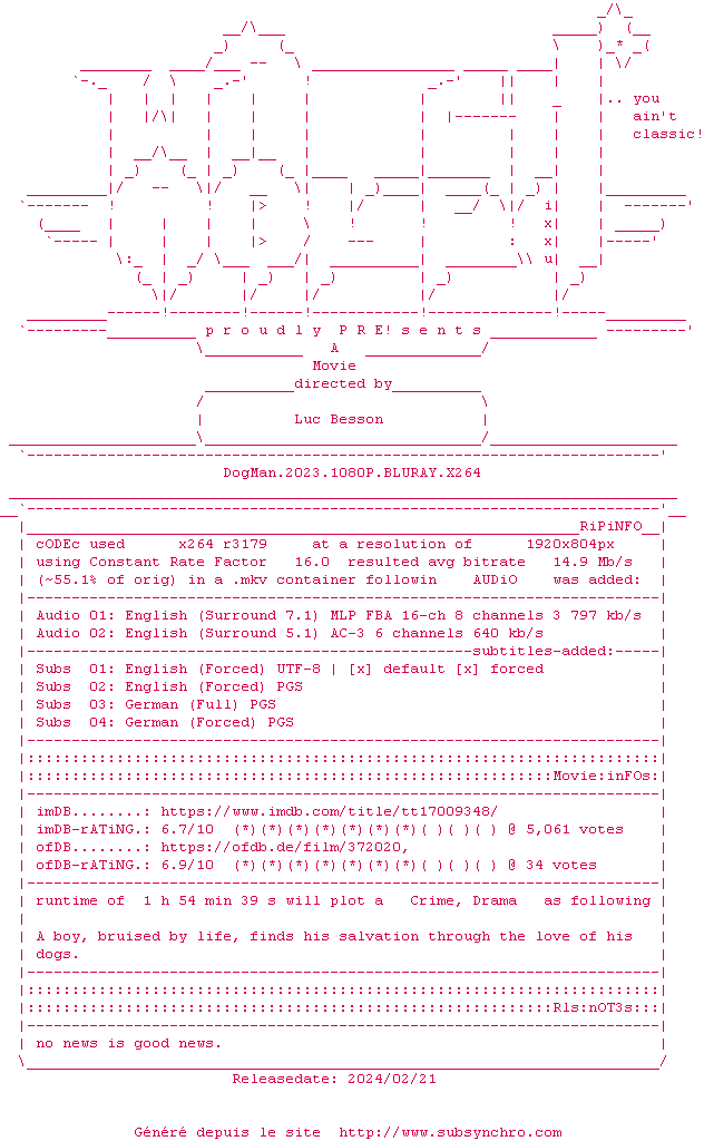 Voir le nfo de la release DogMan.2023.MULTi.1080p.BluRay.x264-Ulysse