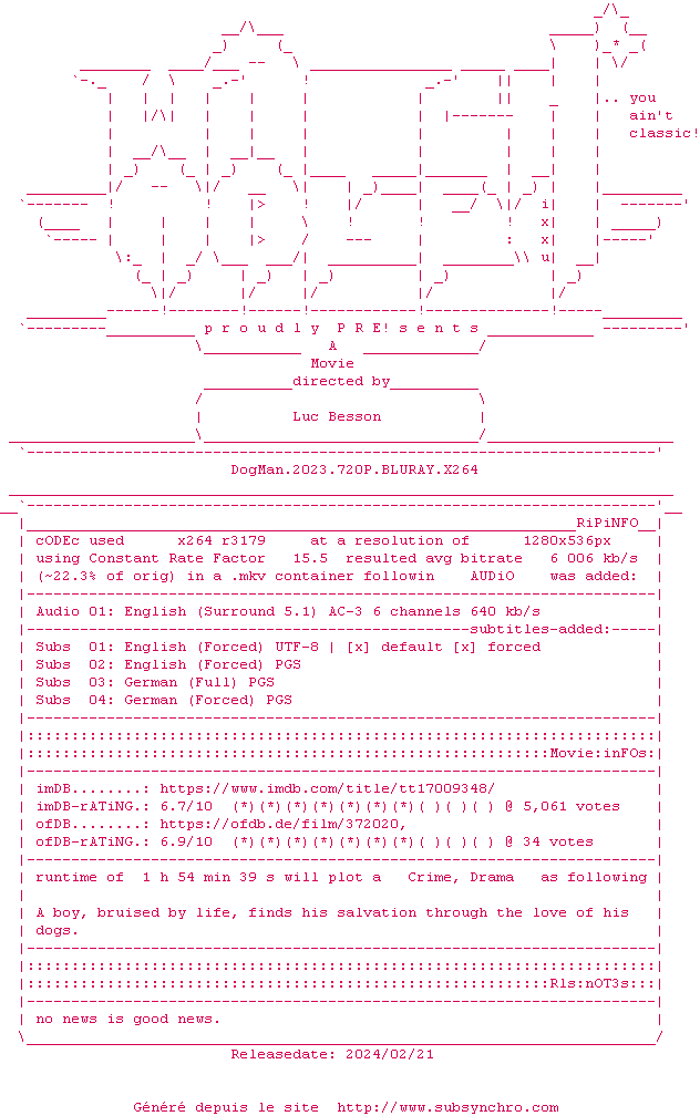 Voir le nfo de la release DogMan.2023.720P.BLURAY.x264-WATCHABLE