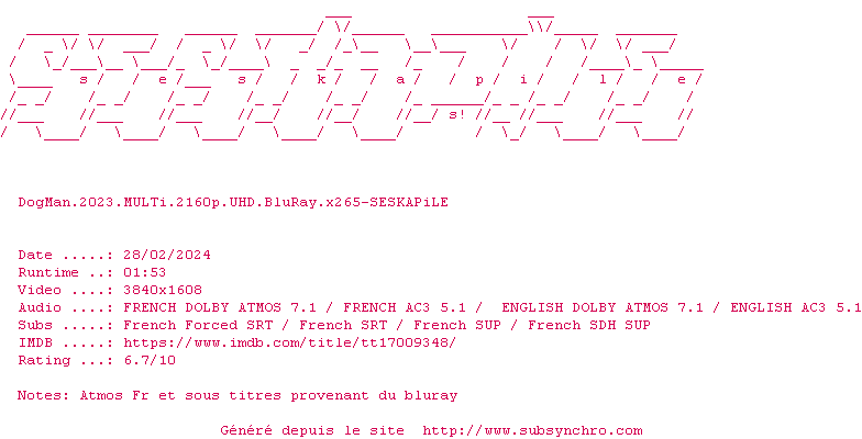 Voir le nfo de la release DogMan.2023.MULTi.2160p.UHD.BluRay.x265-SESKAPiLE